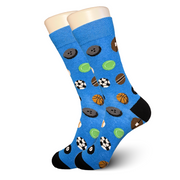 High quality blue cotton socks with Footballs, Bowling Balls, Hockey Pucks, Soccer Balls, Rugby Balls, Tennis Balls, Basketballs, and more on them.
