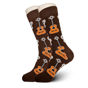 Lets gather 'round the campfire, and sing our campfire song. High quality cotton socks with brown and grey guitars on them.