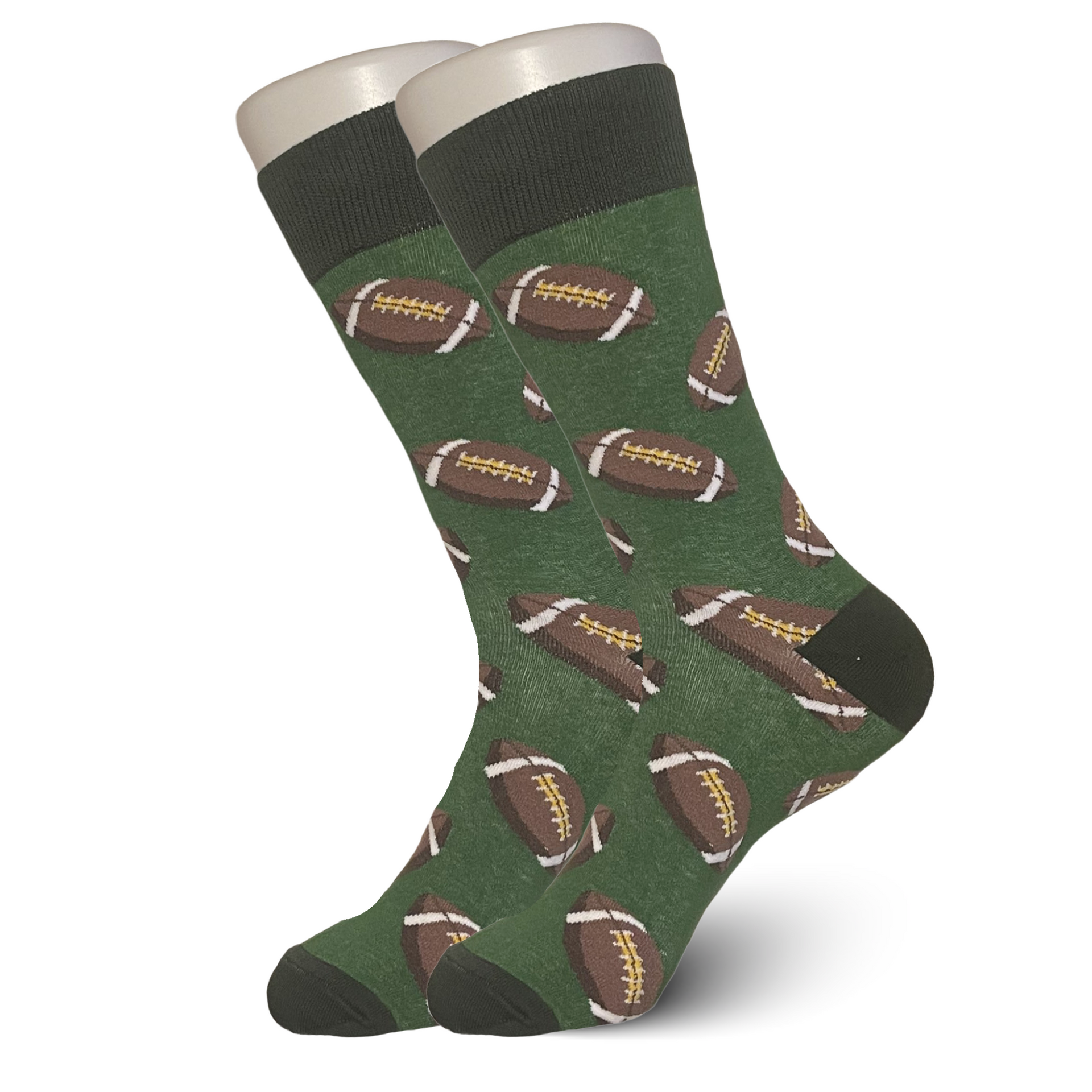 High quality green cotton socks with footballs on them.