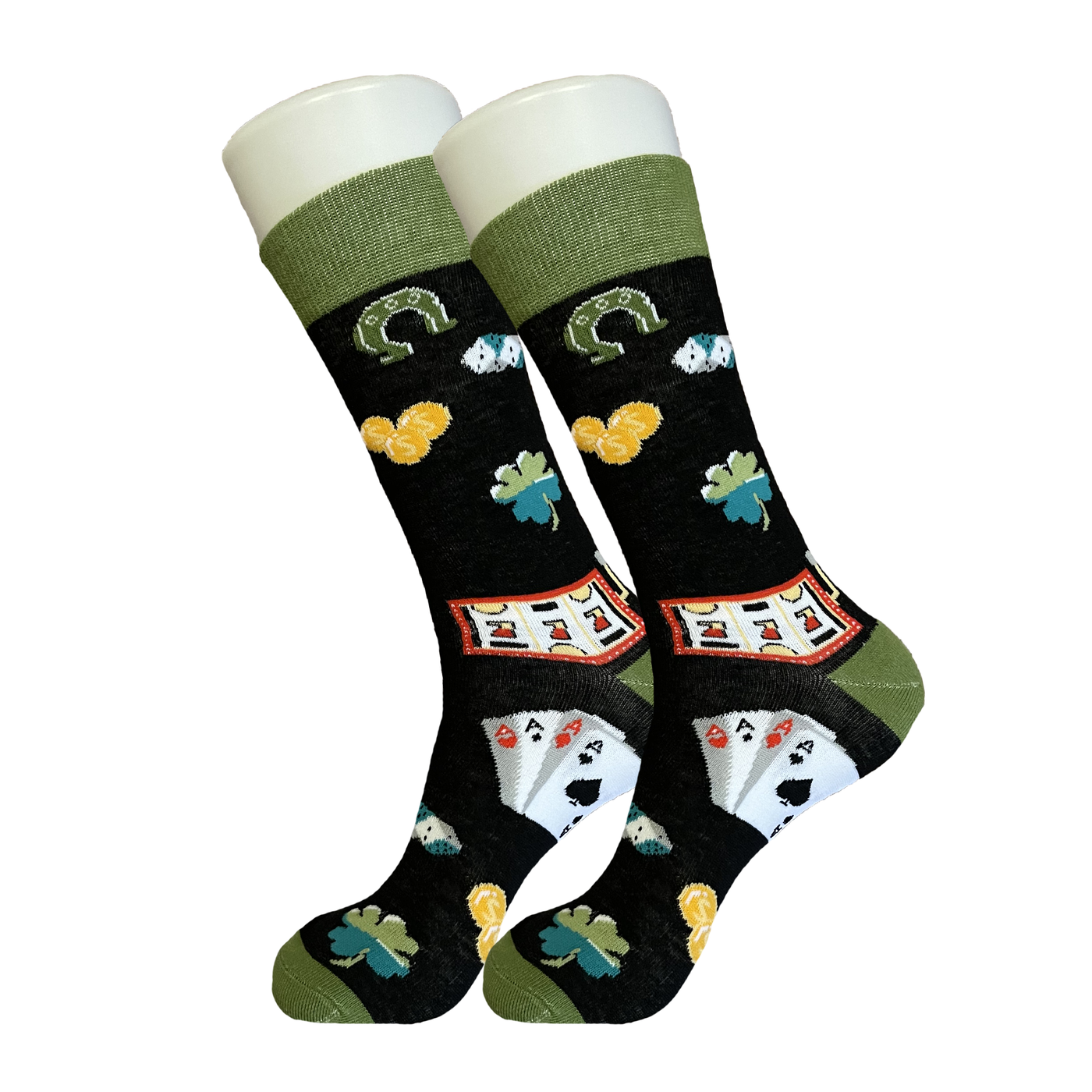 High quality black cotton socks with casino chips, slots, and more on them.