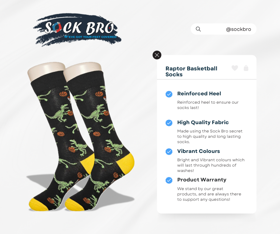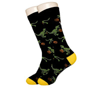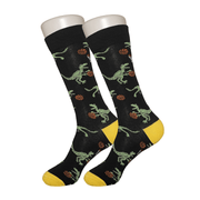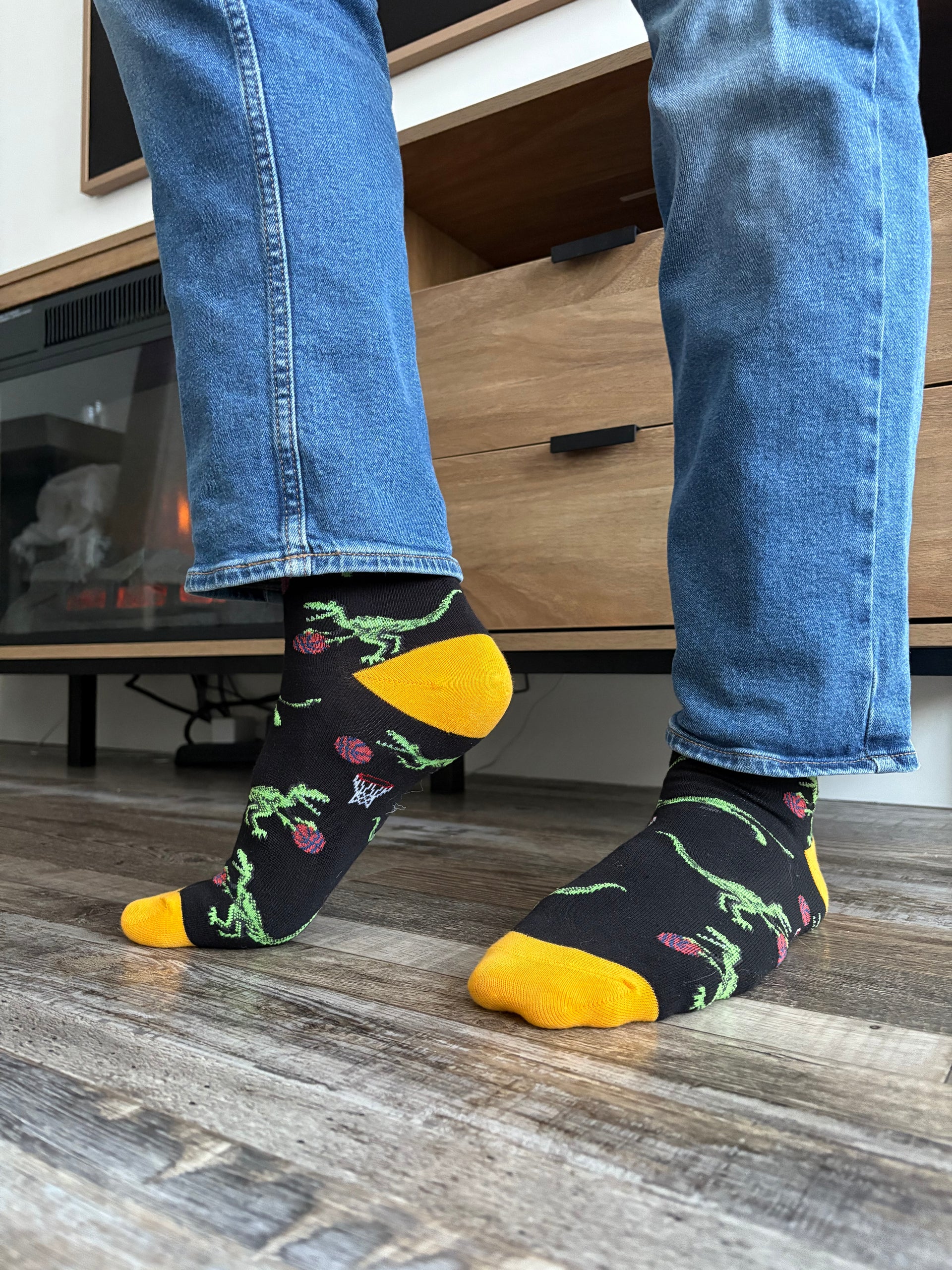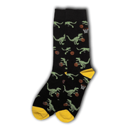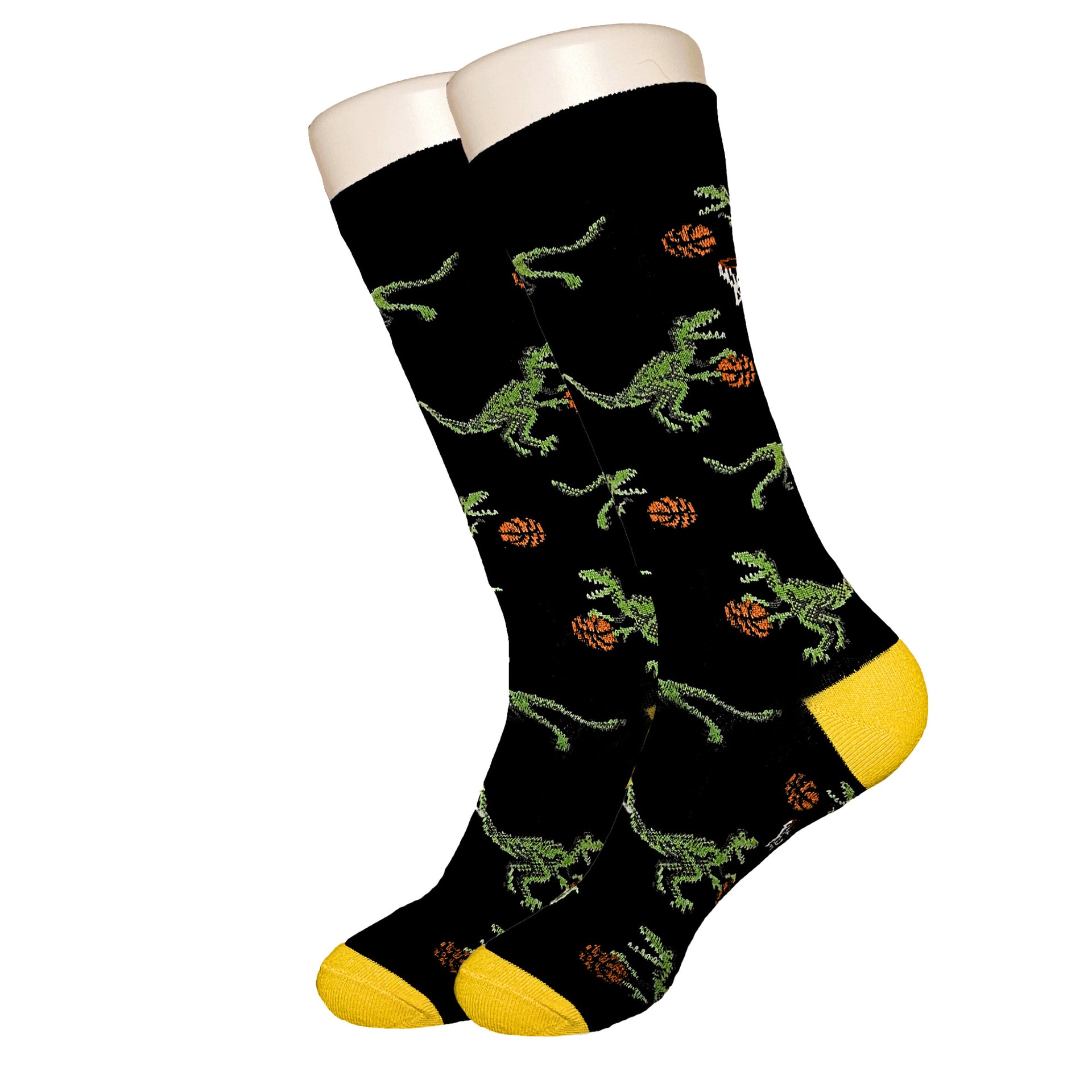 High quality black cotton socks with raptor dinosaurs dribbling a basketball.