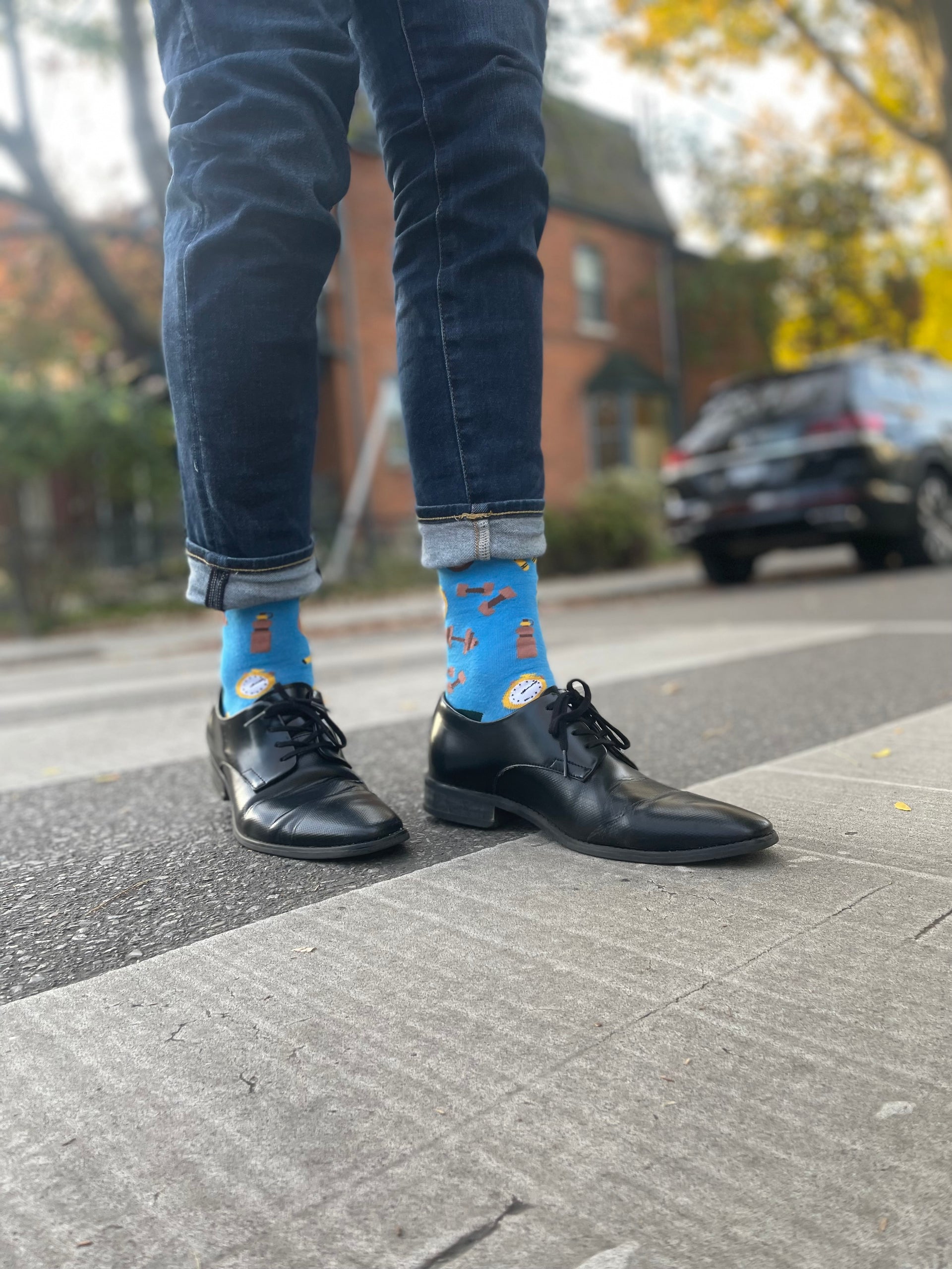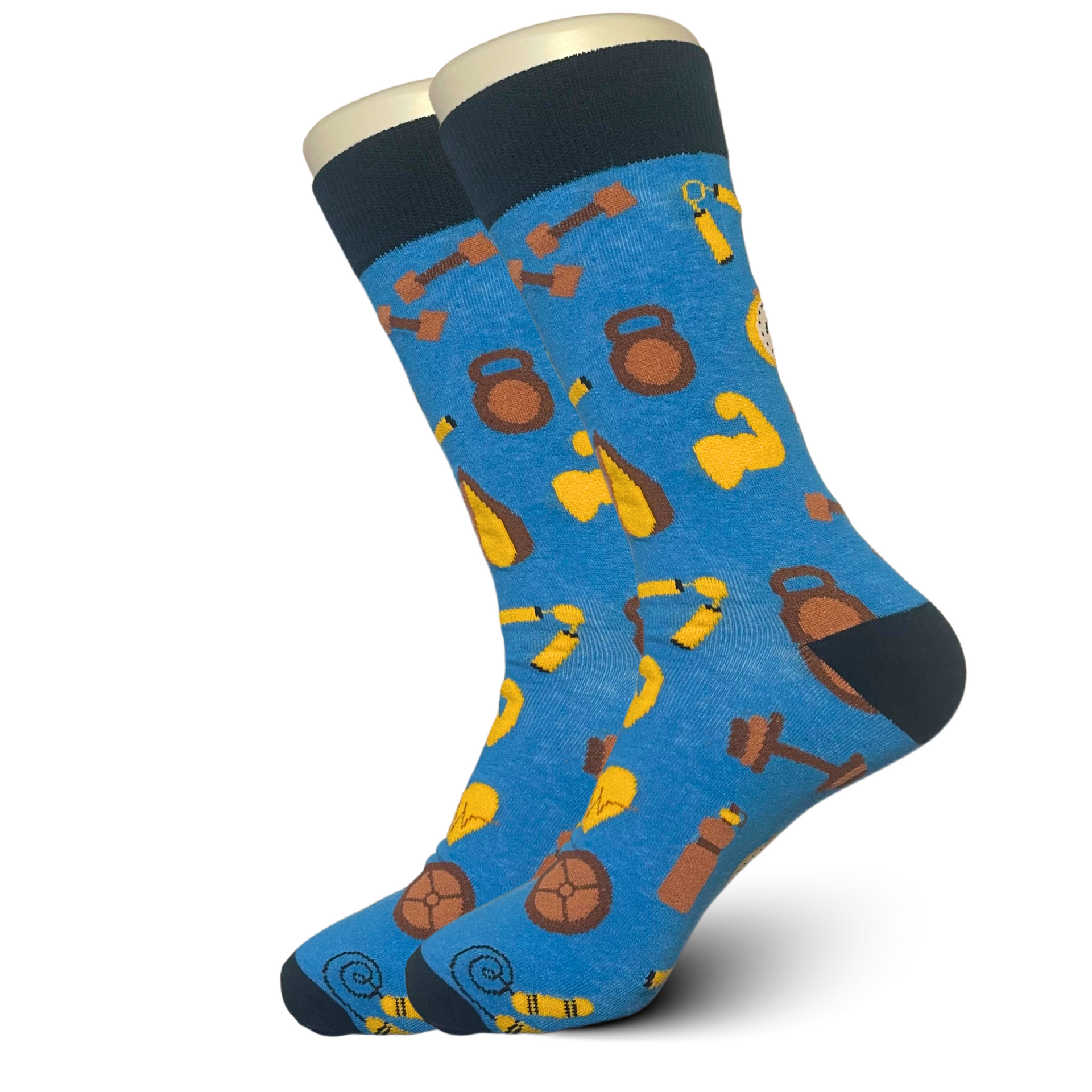 High quality blue cotton socks with weights, punching bags, and skipping ropes on them.