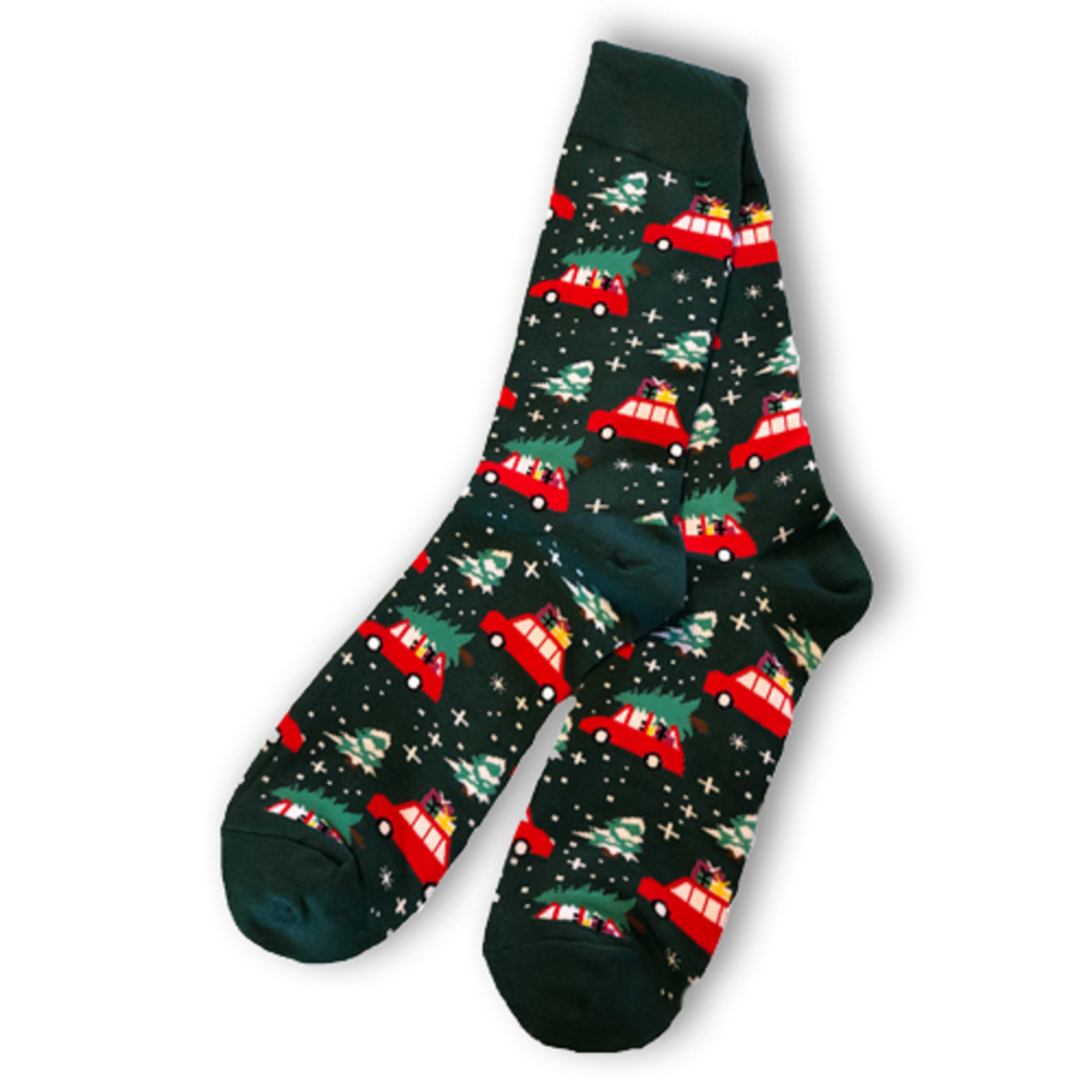 High quality green cotton novelty socks with Christmas Trees and Red Cars on them.