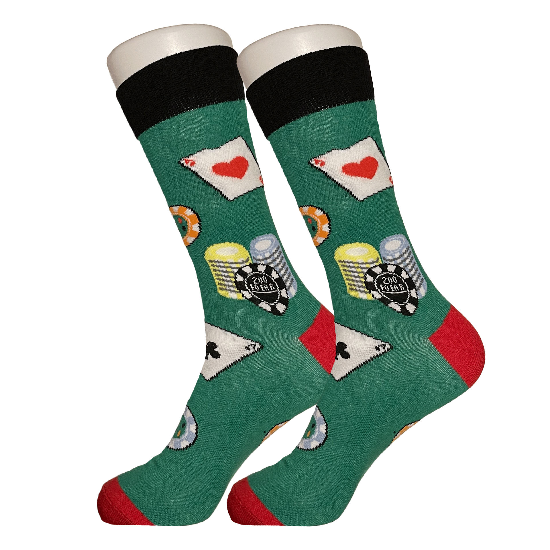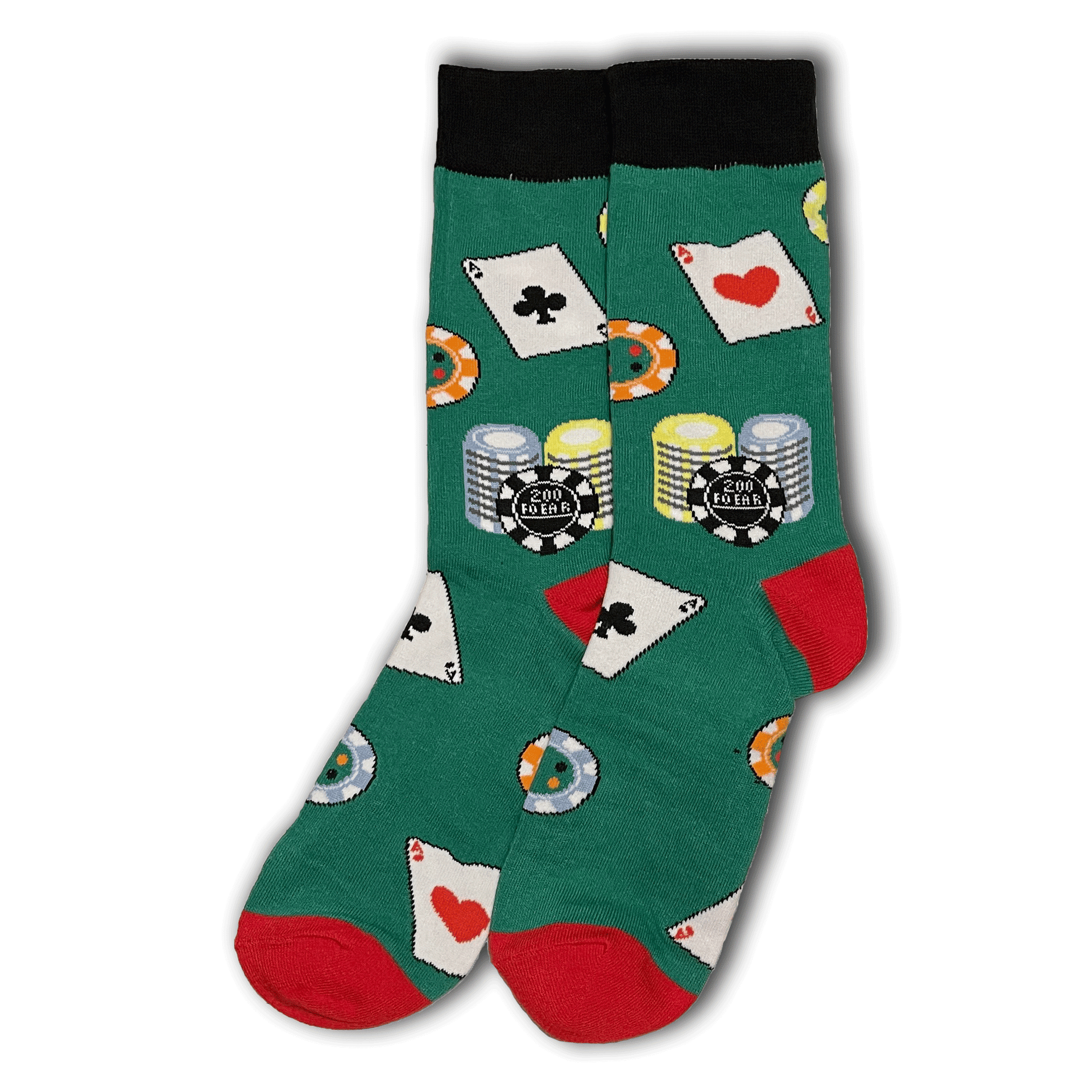 Only for when you're going all in! High quality green cotton socks with poker chips and cards on them.