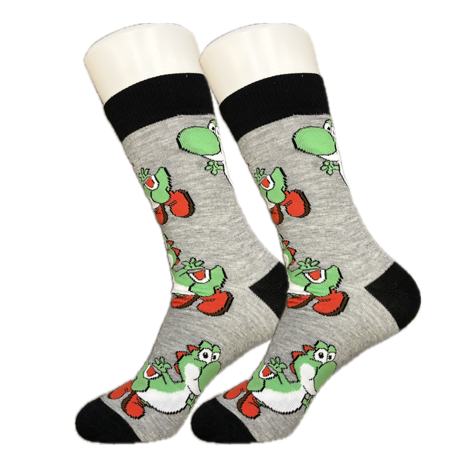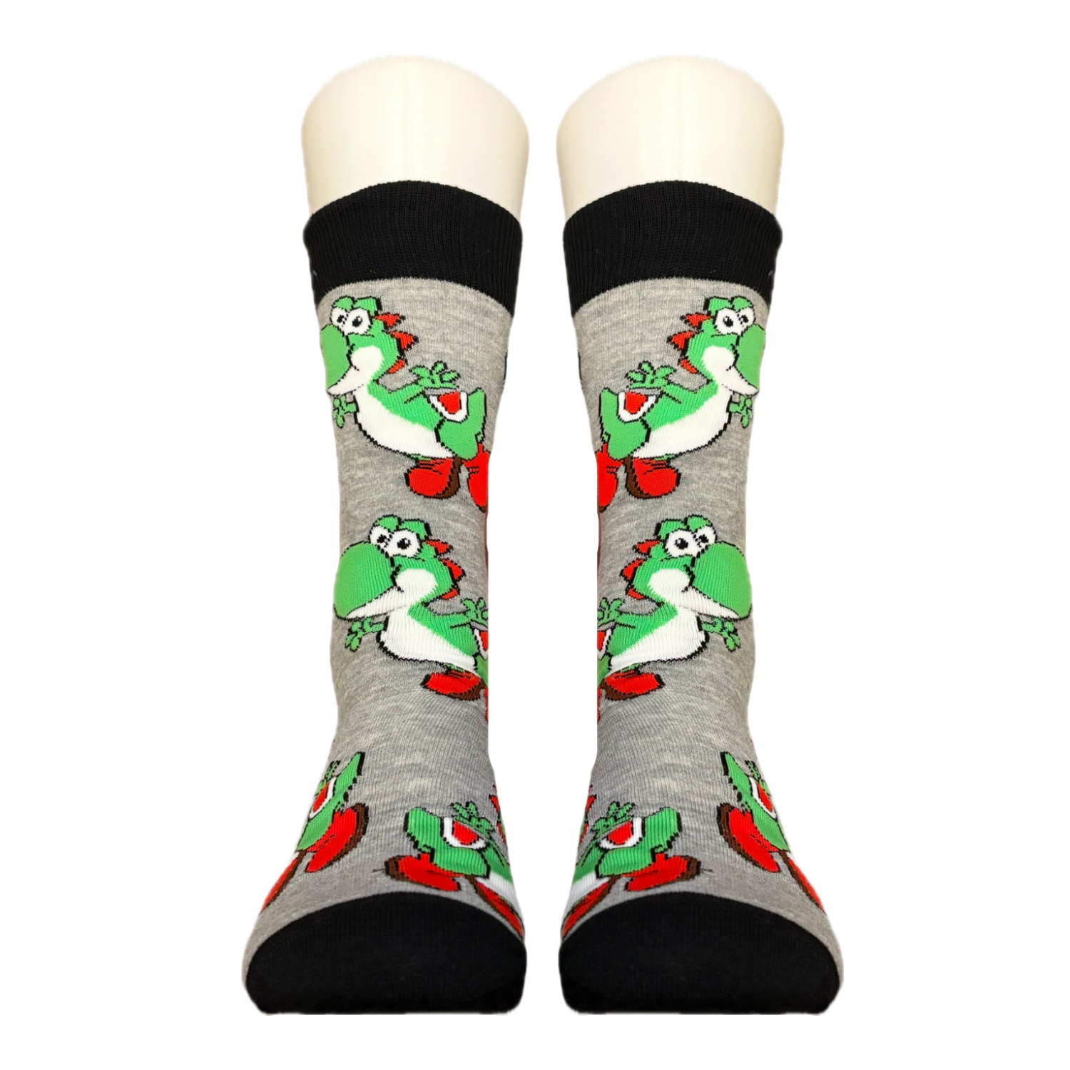 These quirky socks feature everyone's favorite video game dinosaur, Yoshi! The grey color adds a touch of style while the playful character brings a smile to your face. Perfect for any gamer or Yoshi fan. (Double jump into comfort with these unique socks!)