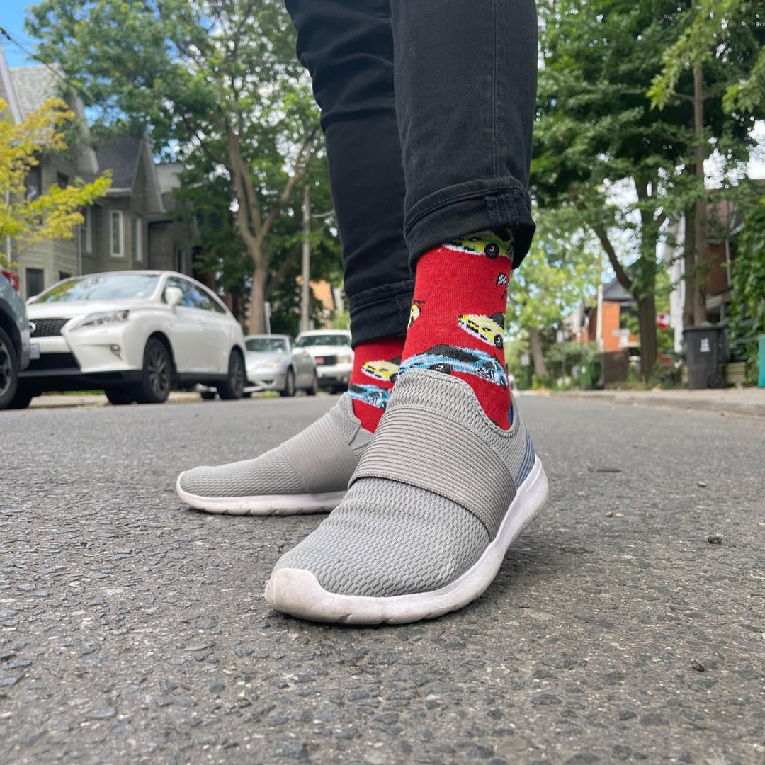 Vroomƒ?ÝVroom. High quality red cotton socks with mixed coloured race cars. Ð?�?