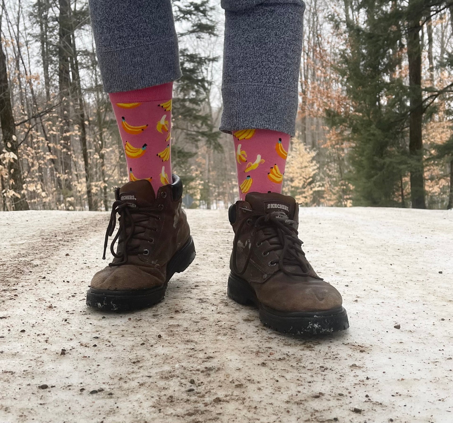 Orange ya glad I didn't say Banana! High quality pink cotton socks with yellow banana's. Composition: 70% Cotton, 25% Polyester, 5% Spandex.