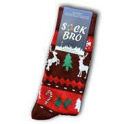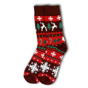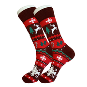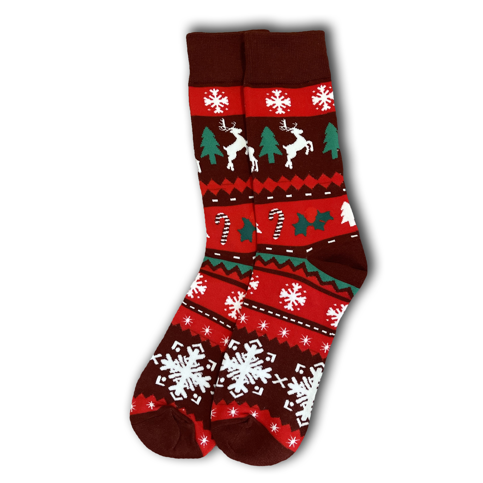 High quality red, white, and green cotton socks with Christmas trees, reindeer, and more on them!